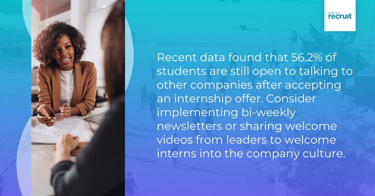 It may seem obvious, but simple emails, newsletters, or other forms of internal company communications go a long way in keeping interns interested and excited about the start of their internship. A big part of the internship experience for interns is feeling integrated into the company culture and with their team. Considering most internships don't start until an average of eight months after the initial offer is extended, employers should aim to over-communicate rather than under-communicate with their interns. Consider implementing bi-weekly newsletters or sharing welcome videos from leaders or members of team they'll be working with.