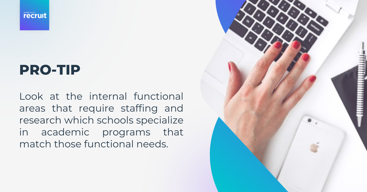 The first step in creating a campus recruiting strategy is to identify internal company hiring needs, as well as which campuses to target for these hires. Knowing the type and level of knowledge required will enable recruiters to select the right programs to source from.