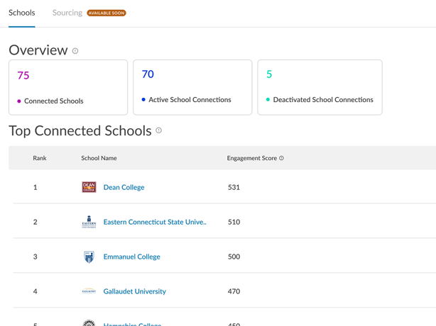 Get the data and insights you need to inform your recruiting strategy. Out of the box reports such as our Top Connected Schools leaderboard, Candidate Pipeline dashboard, and Sourcing dashboard help you understand which schools, Recruit sourcing tactics, and jobs perform the best for your company.
