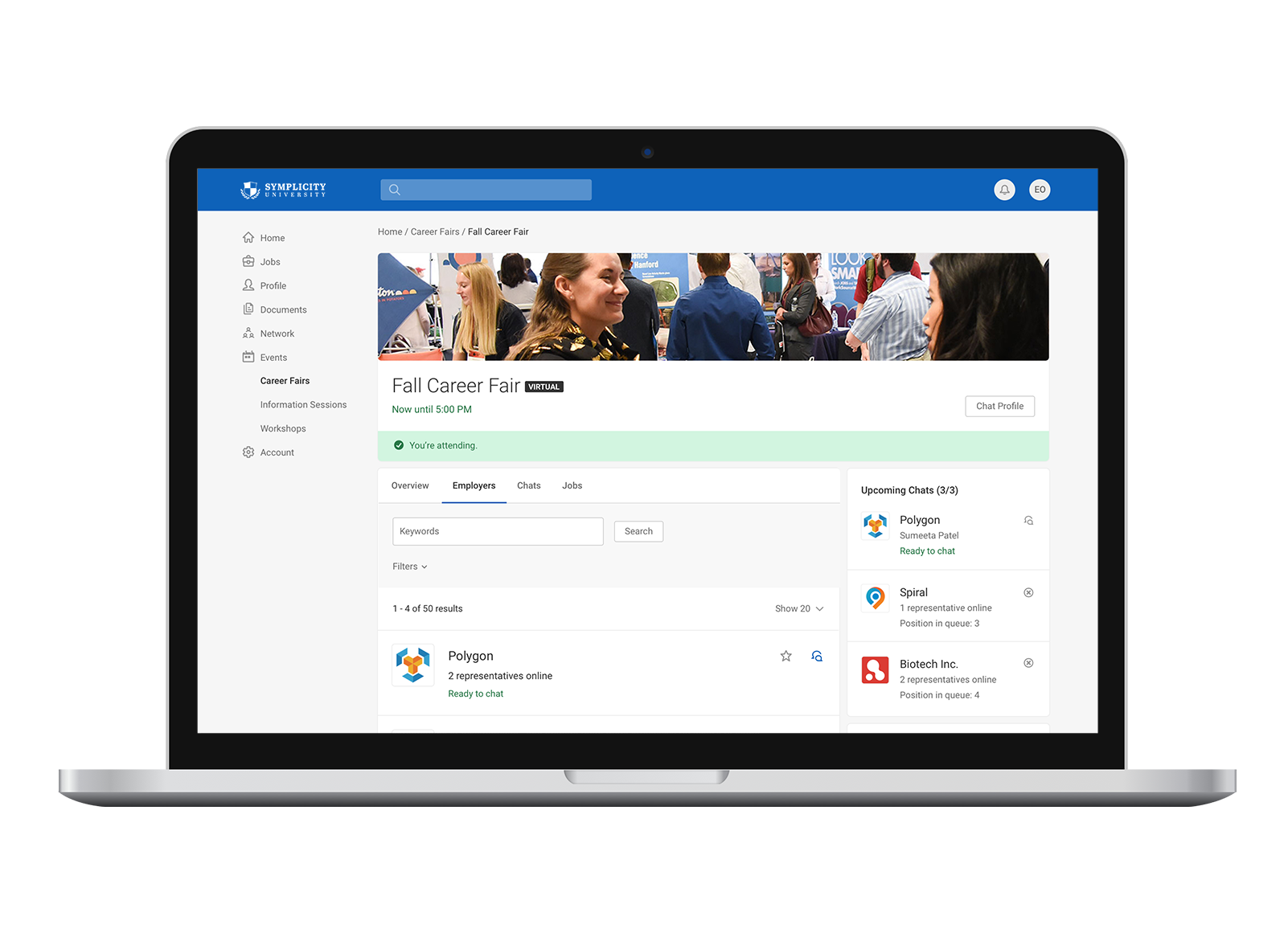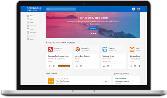 Our solution consists of a set of features that enable career centres to interact with students and employers anywhere and at any time facilitating both hybrid and virtual recruiting environments.